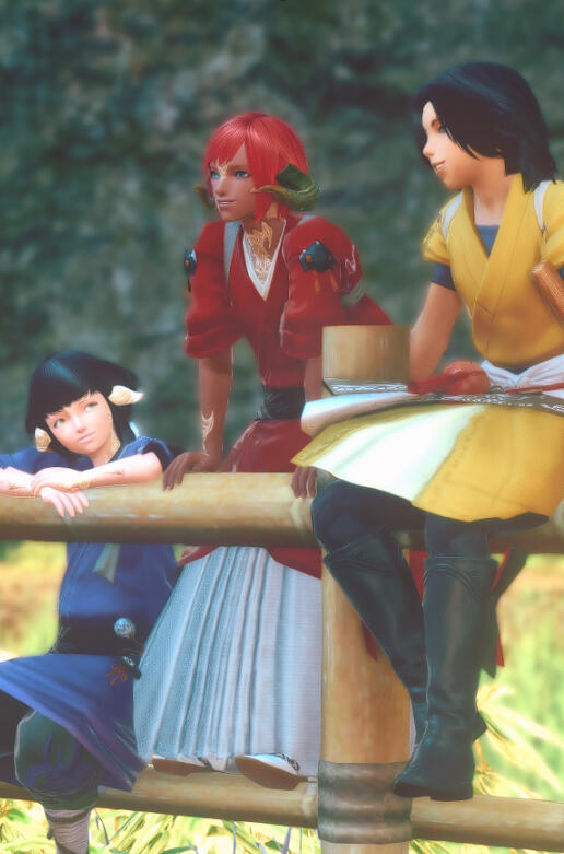 Born just outside Doma, Akagi was raised in relative solitude. With just themselves and their mother, early childhood made Akagi unsure, and clingy— but extremely curious. Eventually, after working up the nerve, they wandered into Doma, where they met a much younger Hien and Yugiri. They grew close, and dreamed of repelling the Garlean Empire that held their home in a choke hold. Their yearning was cut short, however, after their mother learned of their intent to join the resistance. The next morning they were on a boat headed to Eorzea, and— their mother thought— safely far away from the conflict at home.